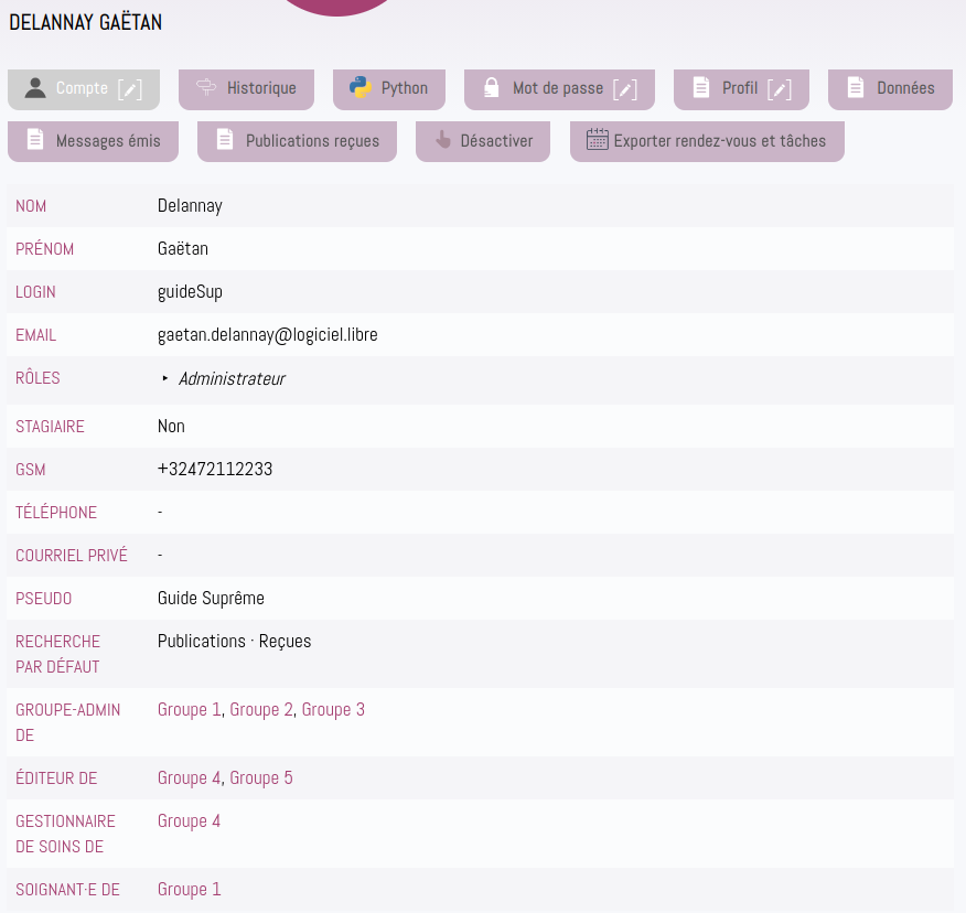 Les données qui vous identifient au sein du logiciel apparaissent en premier: nom, prénom, login (identifiant de connexion) et adresse mail. La zone Rôles devrait être vide pour vous, à moins que, comme moi, vous ne soyez administrateur complet de la plateforme, ce qui n'est possible que moyennant un versement d'un million d'euros sur un de mes comptes aux îles Caïman.